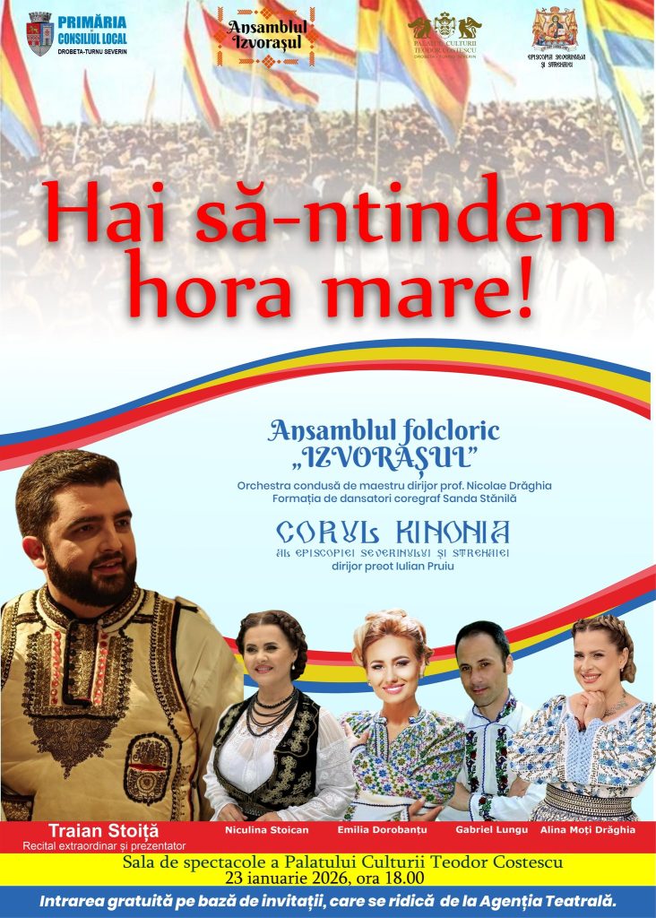 Primăria si Consiliul Local Drobeta Turnu Severin in parteneriat cu Ansamblul Izvorasul, Palatul Culturii Teodor Costescu si Episcopia Severinului si a Strehaiei, organizează in data de 23 Ianuarie 2026, un spectacol de suflet, plin de emoție, și mândrie românească!