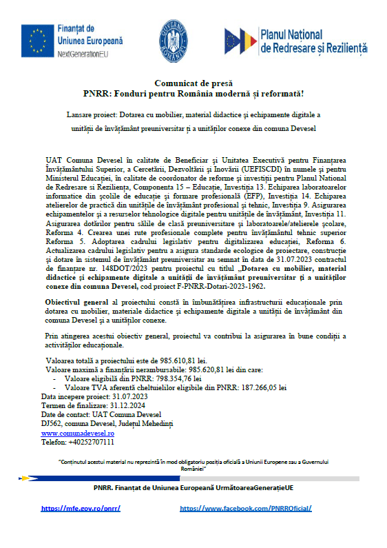 Comunicat de presă PNRR: Fonduri pentru România modernă și reformată! – Comuna Devesel