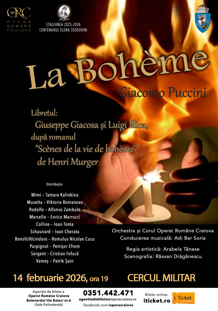 Reprezentația din această săptămână aduce pe scenă o distribuție specială: Tamara Kalinkina (Mimi), Viktoria Romanova (Musetta), Alfonso Zambuto (Rodolfo), Enrico Marrucci (Marcello), Ioan Toma (Colline) și Ioan Cherata (Schaunard), alături de Romulus Nicolae Cucu (Benoît/Alcindoro), Petrișor Efrem (Parpignol), Cristian Fofucă (Sergent), Patrik Șain (Vameș) și Orchestra și Corul Operei Române Craiova, sub conducerea muzicală a maestrului Adi Bar Soria.